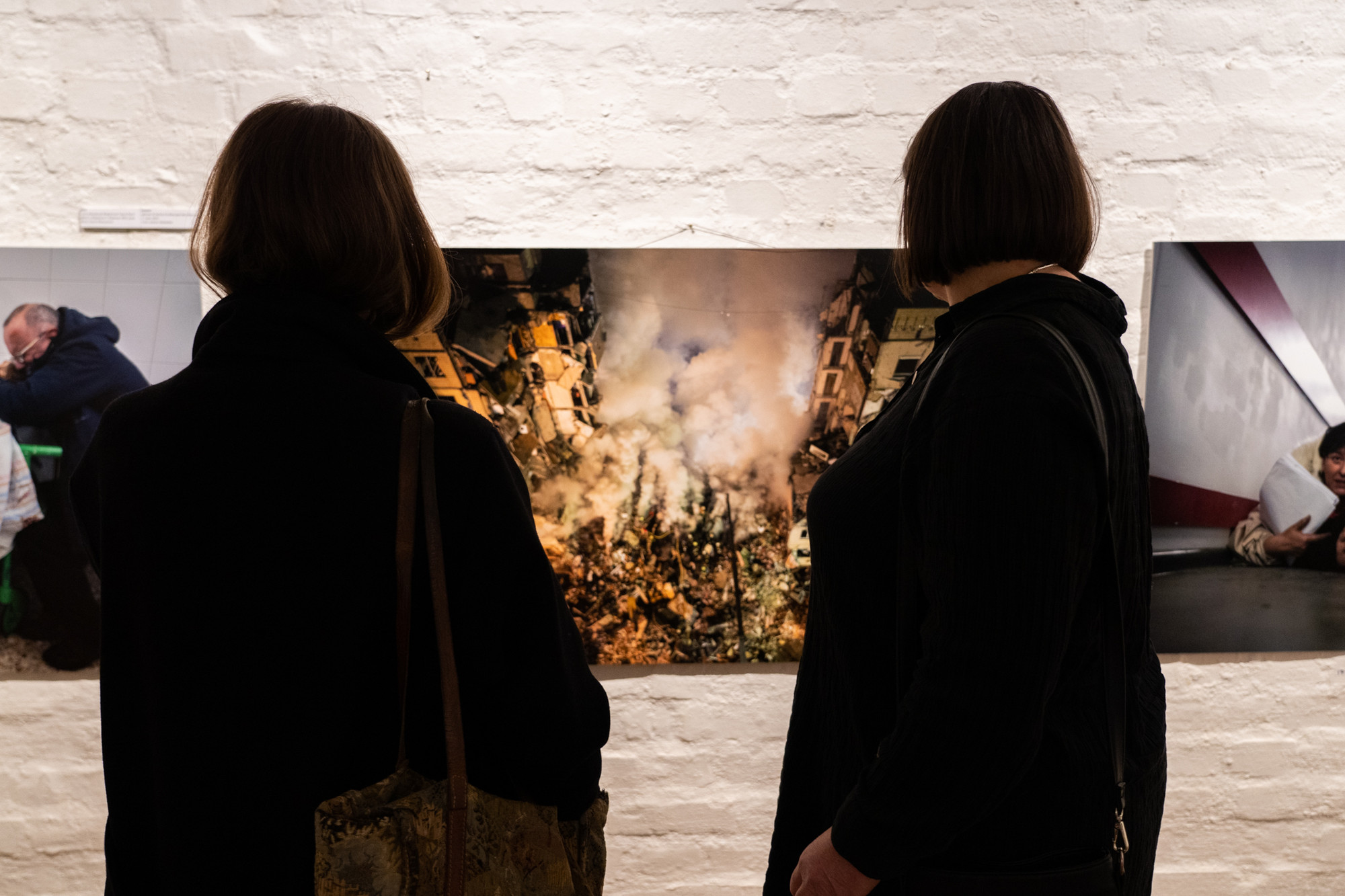The works include portraits of murdered Ukrainian civilians made by caricature artist Victor Melamed and photographs by Oleksandr Klymenko, who visited the exhibition on 18 February, as well as by Evgeniy Maloletka, one of the winners of the Free Media Awards 2022.
