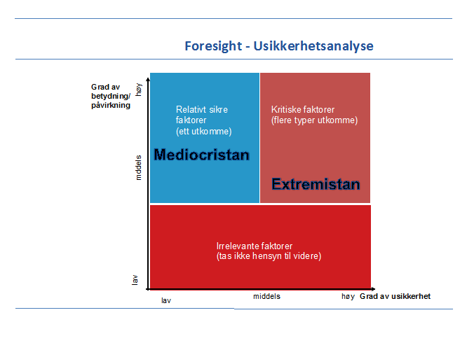 Figuren til høyre kan illustrere betydningen av å utforske det ”utenkelige rom”, ikke fordi man tilstreber å gjette riktig og få rett i ettertid, men snarere fordi dette styrker blikket for det uforutsette, beredskapen for å takle uventede hendelser, samtidig som det trener deg opp i å tenke uortodokst og kreativt. Øvre høyre områd er gjenstanden for framtidens planleggere og utredere. Den såkalte mest sannsynlige framtiden basert på framskrivning av historiske utviklinger (Mediocristan) tilslører betydningen av brudd, hendelser og at utviklingen i verden i stadig større grad preges av betydelige og overraskende hendelser (Extremistan). Vi må bevege oss fra Mediocristan til Extremistan. Det er nettopp Extremistan som i alle år har vært fremtidstenkningens (foresight, futures studies) ambisjon.