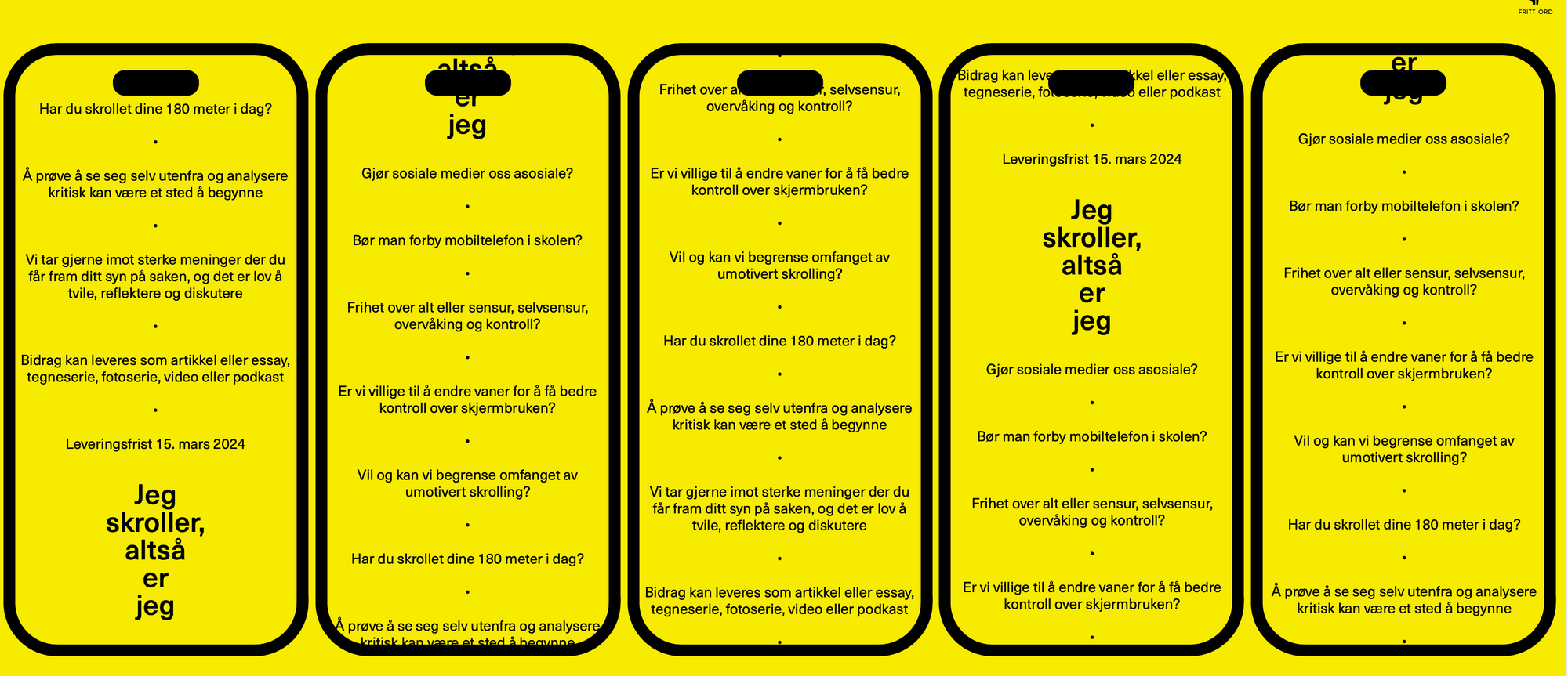 Fritt Ord ønsker å spørre skoleungdom: Hva mener du om skjerm? Oppleves det som et problem? Oppleves debatten om skjermbruken reell også for ungdom, eller er det en debatt unge blir påført av voksensamfunnet? Når vi lever våre liv gjennom skjerm og sosiale medier, hvordan forholder vi oss til desinformasjon, falske nyheter og andre villedende kilder?