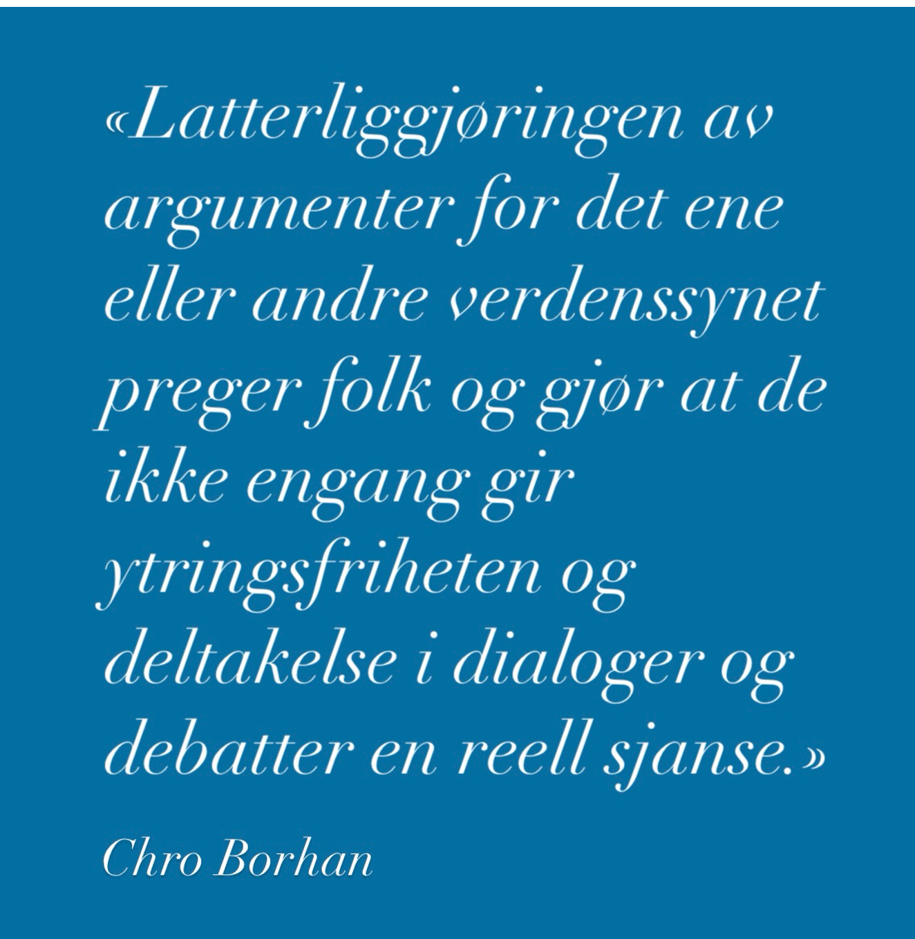 Latterliggjøringen av argumenter for det ene eller andre verdenssynet preger folk og gjør at de ikke engang gir ytringsfriheten og deltakelse i dialoger og debatter en reell sjanse. Det som bekymrer meg mest med slike situasjoner er at vi kan gå glipp av svært viktige løsningsforslag på utfordringer vi står overfor.