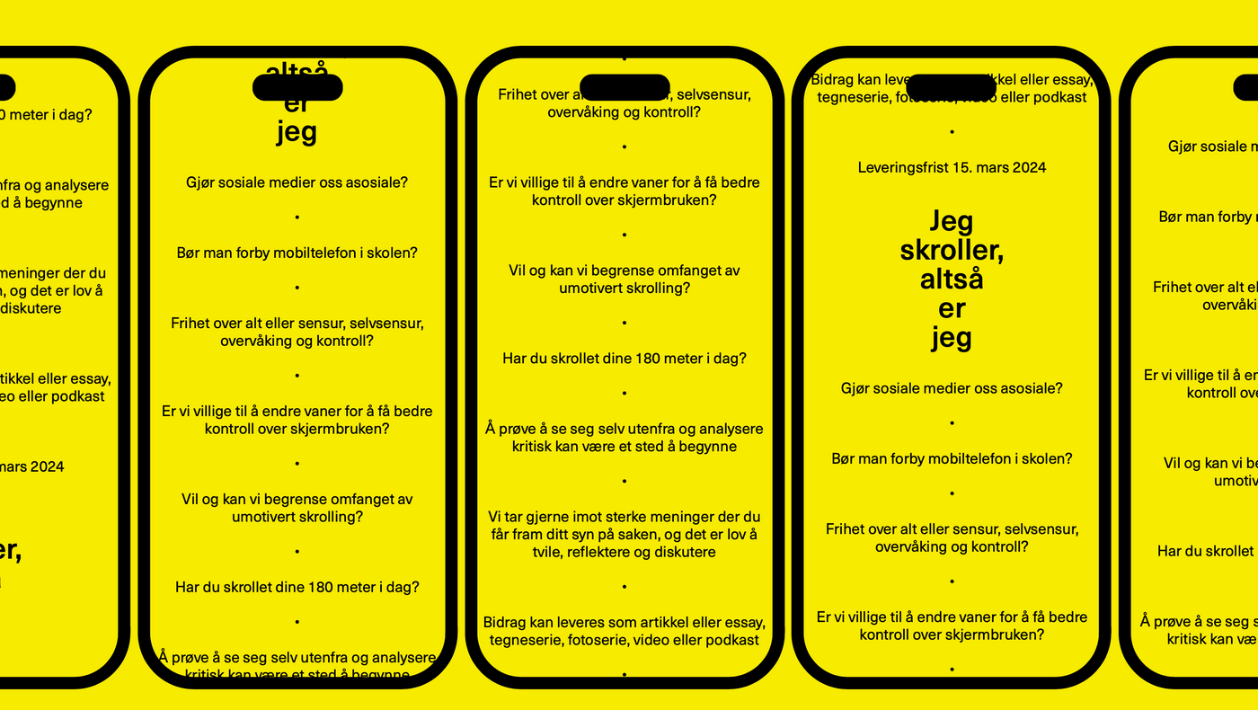 Fritt Ord-konkurransen for videregående skole 23/24 har temaet «Jeg skroller, altså er jeg». Fritt Ord inviterer til lærerseminar om skjermliv og teknologi i klasserommet fredag 1. desember kl 09-15.